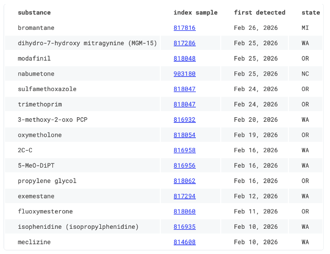 Here are the 15 new things we found in the drug supply last month. You can see the full list here, updated monthly. Just because we are seeing it for the first time, doesn't mean it hasn't been circulating already.